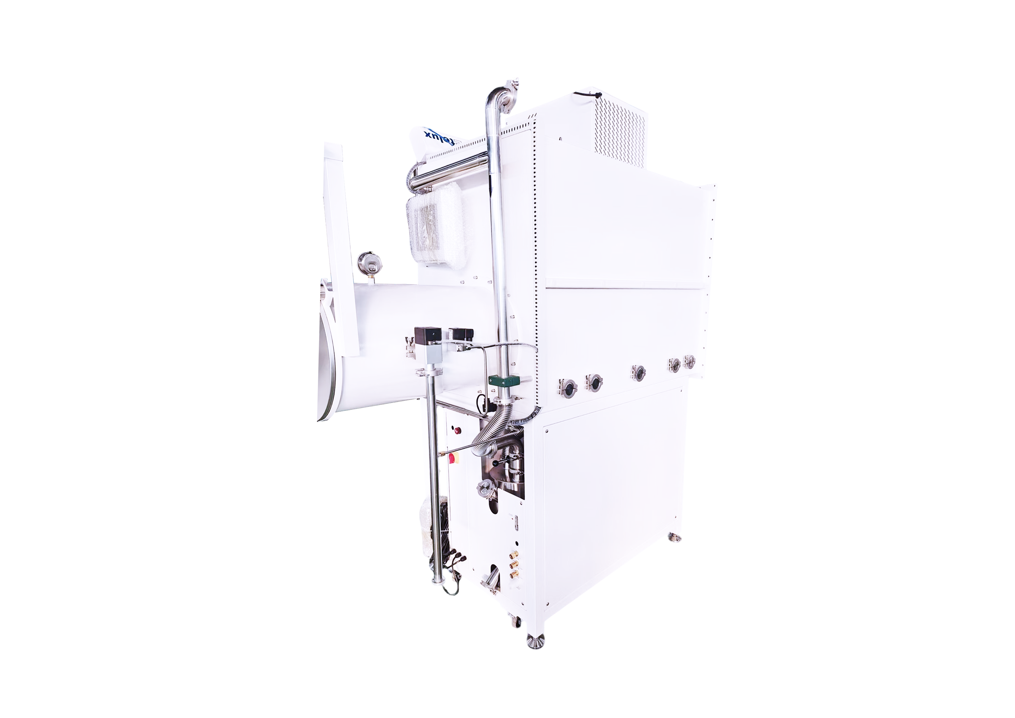 超越传统手套箱仅控制气氛(水氧)的范畴,集成高精度恒温恒湿机组,能对箱内大空间进行精准的温湿度调控,通过特殊的风道设计,确保2.4米宽的巨大操作空间内,温度场和气氛浓度场高度均匀,避免因位置不同导致工艺结果差异。可集成多源蒸镀机、旋涂机、退火热台、光电测试探针台、精密点胶机、键合机等设备,进行从基板清洗→薄膜沉积→器件封装→初步测试的完整流水线式操作,将多个分散的工艺步骤整合在一个受控的“超净间中的超净间”内完成,成为光电前沿实验室或中试线的“光电工艺核心平台”,是推动光电技术从实验室走向产业化过程中的关键装备。
