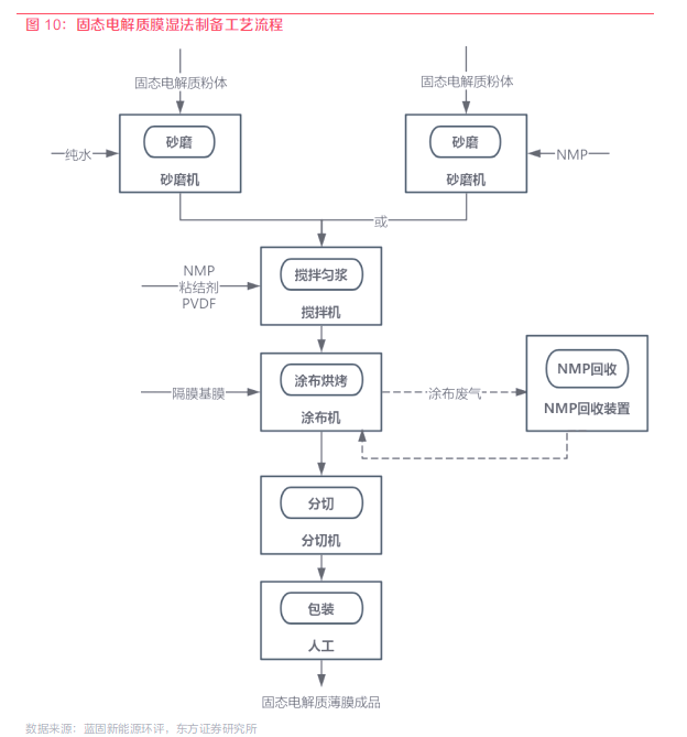 与极片制备方法相似,硫化物电解质膜的制备也主要采用干法和湿法两种工艺。湿法工艺中,溶剂被用来溶解粘结剂,然后与固态电解质粉末进行混合,经过涂布和烘干后形成膜材。这种方法的膜厚主要由浆料的固含量和涂布缝隙的宽度来决定。值得注意的是,溶剂-粘合剂对的选择以及工艺参数的优化,对硫化物电解质膜的离子电导率和加工性能有着显著的影响。