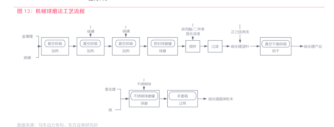 机械球磨法的制备流程包括:首先,在惰性高压容器中按质量比1:0.8加入金属锂和硫磺,置于250℃~300℃的真空烘箱中保温2~3小时,再加入等量硫磺并保温。接着,将高温灼烧得到的硫化锂粗产品放入密封的球磨罐中,以100~500r/min的转速室温球磨12~24小时。之后,将球磨后的硫化锂加入异丙醇与二甲苯的混合溶液中搅拌1~2小时,再经过滤和淋洗得到硫化锂湿料。最后,将湿料放入205℃的真空干燥烘箱中烘干8~12小时,从而得到硫化锂产品。